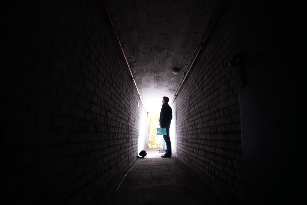 Bardo (from the Tibetan བར་དོ་ – intermediate state, in-between state, transitional state) relates to the constant evolving moment in between past and future: the Now. It is the change from one state into another, a flowing transformation of realities. This installation was located in the passageway of the underground area of a former crematory. Architectonically it is a zone in which bodies circulate from one space to another. Copper tubes were integrated into space and played by transducers. The metal of the tubes resonates by sine waves, the sound sources (invisible, hidden behind the copper tubes) become difficult to locate. The passageway points toward a golden shining door, rustling softly in occasional breezes. A sense of strangeness shapes the atmosphere.