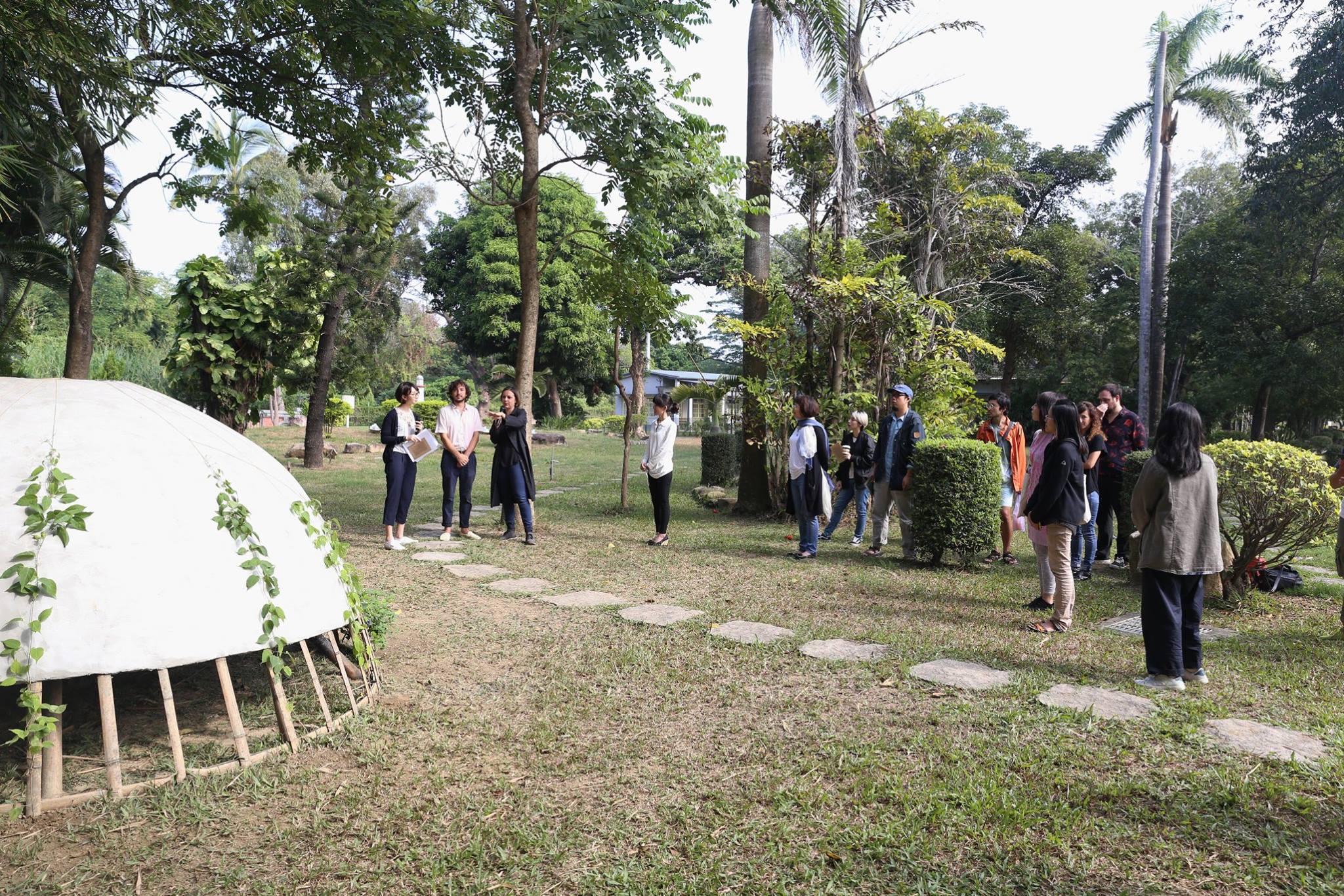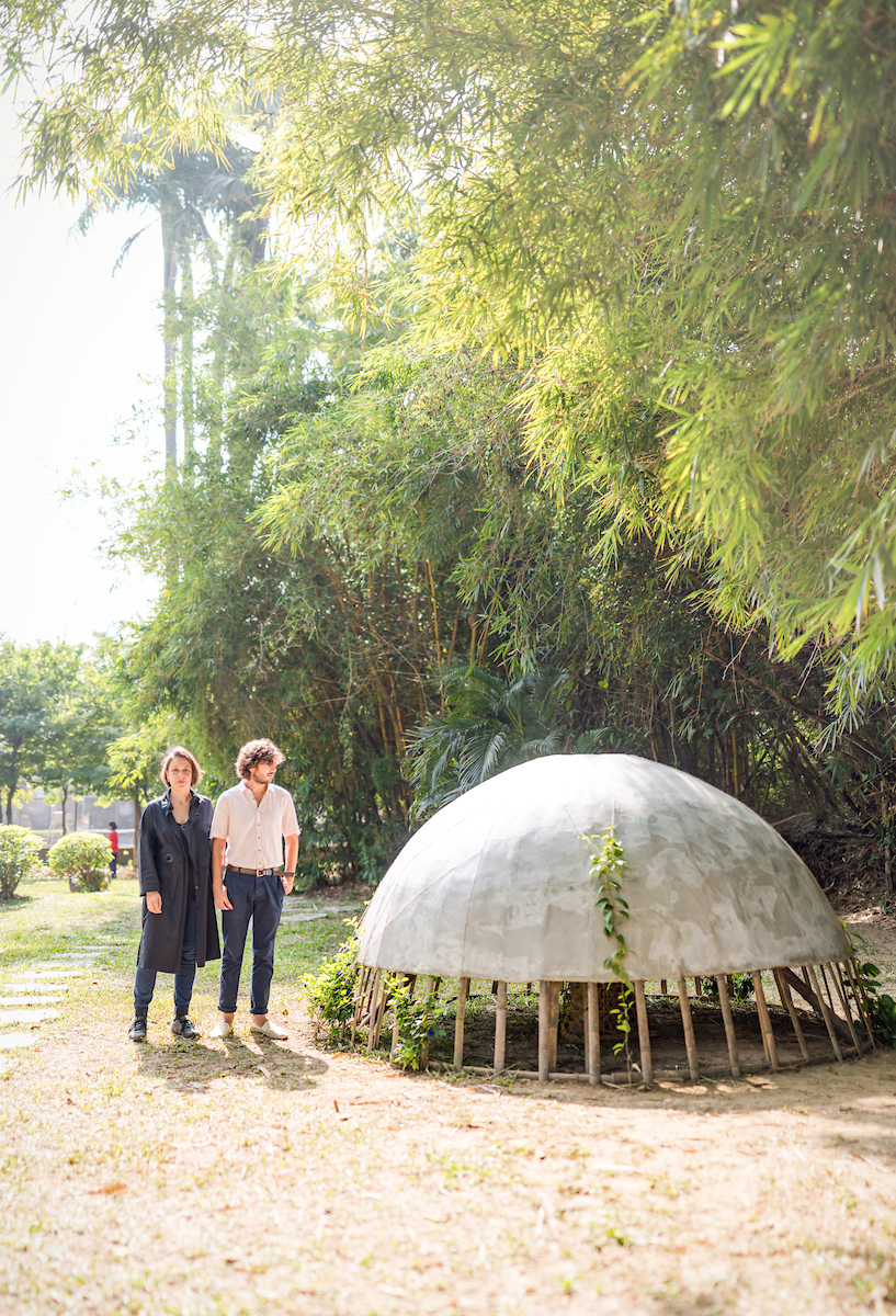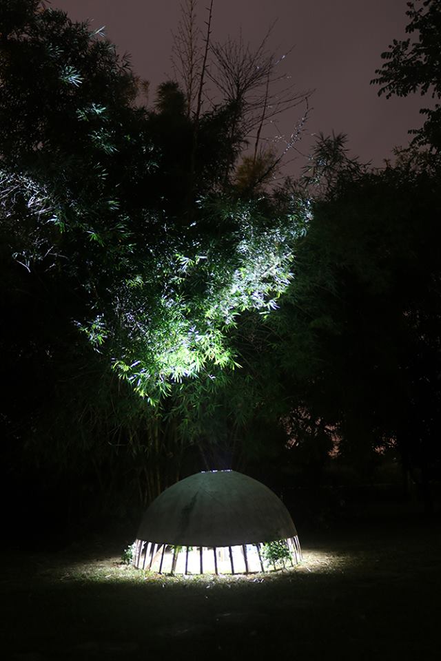 Nest is a site-specific environmental artistic project. It is a permanent public soundinstallation located in a public Arts Park. The former factory complex, in which the piece is situated, is a monument to and an artifact of the industrialization process, which contributed to the current aural state of the Tainan area.The construction methods used to realize the structure mimic the architectural techniques unique to the area.The sculpture was inspired by the architectonic shape of a church’s dome, giving it unique acoustic properties.