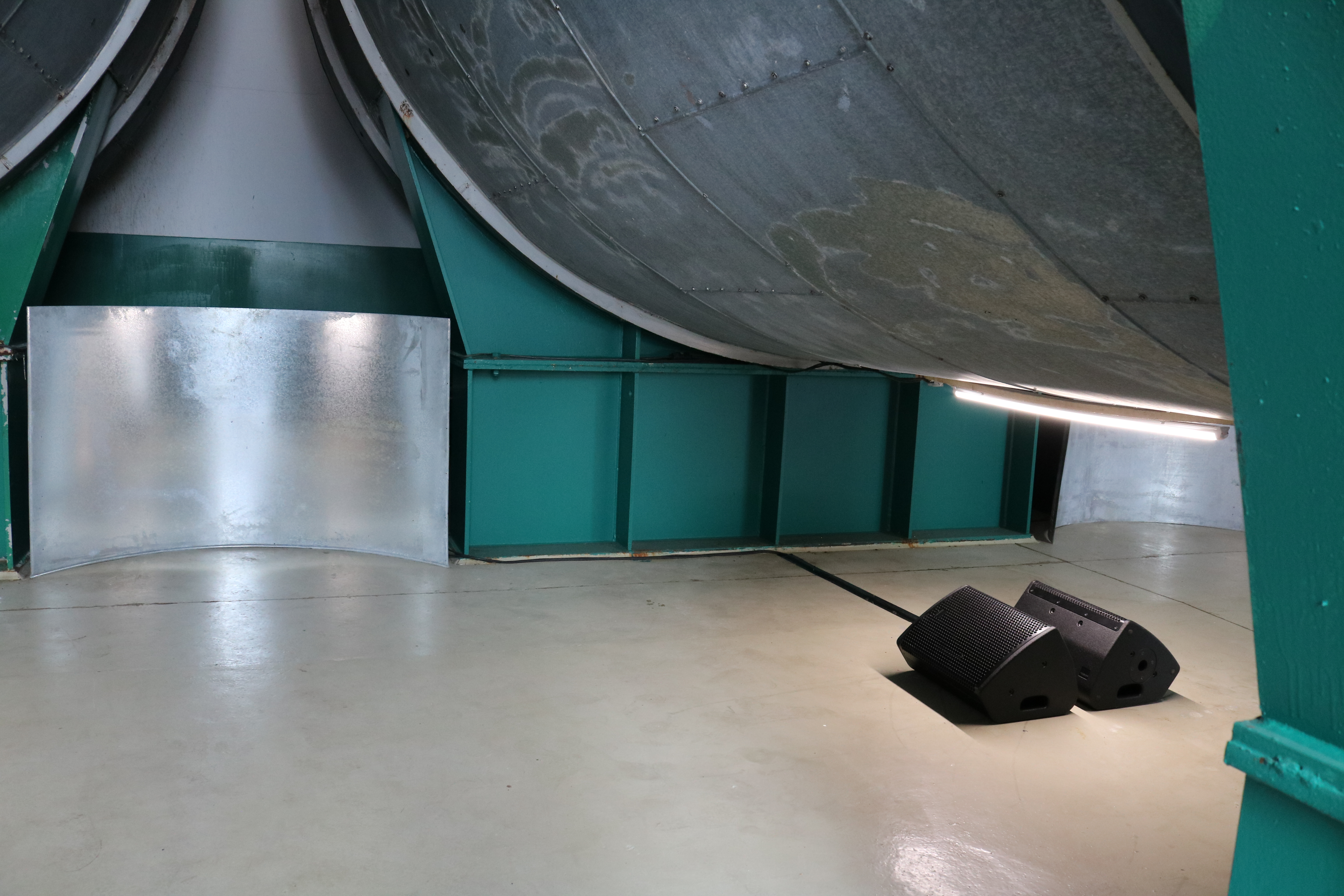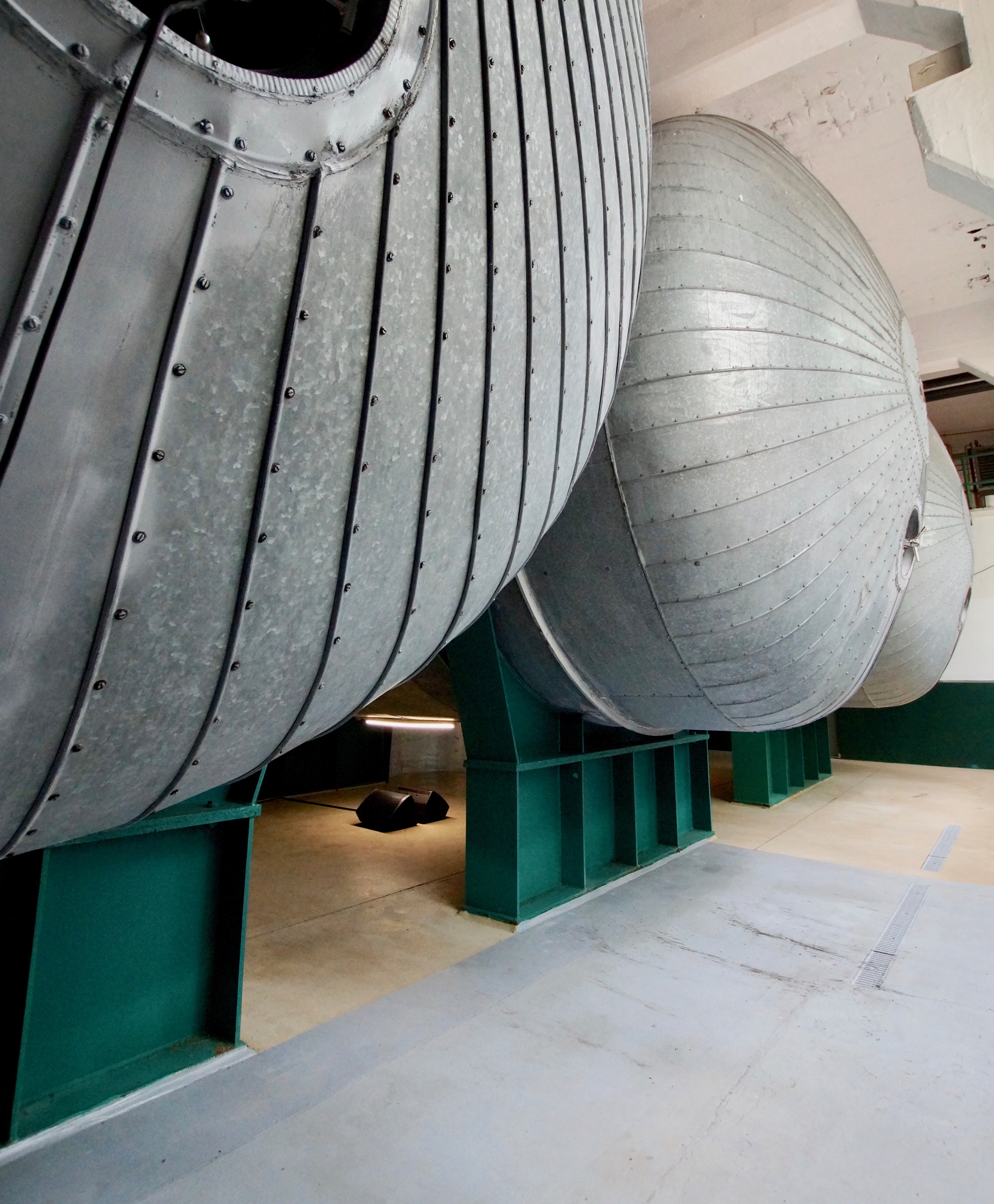 Kesselrausch is a site-specific sonic installation in a room of the former Braustolz brewery. The three 100.000 l tanks used for storing beer have still an impressive visual presence. Now, these become resonant bodies. Loudspeakers inside the cavities of the metallic storage tanks are echoing by low frequent and metallic sonic events, recorded inside the brewery. Turbines of airplanes are intertwined with these local sounds. The room becomes a roaring, vibrating and stormy sonic field. This agitated sea of sounds honors the remains of the former brewery. Transducers attached to metallic surfaces transmit vibrations making these resonate. The architectonic body and its organs, the machinery of the brewery, vibrate, dance, sing. The anatomy of the building, its objects, its limbs, and skeleton, become living bodies. Resonance phenomena arise, connecting various oscillating systems. This combination of objects and their environment; of sound, material, body, and air, is like the experience of intoxication or ecstasy, in which the separation between us and our environment is abolished. The visitor’s body composes its personal acoustic-spatial experience through movement in space, experiencing various acoustic effects since as many different listening positions as possible are created by the sound sources placed throughout the room.