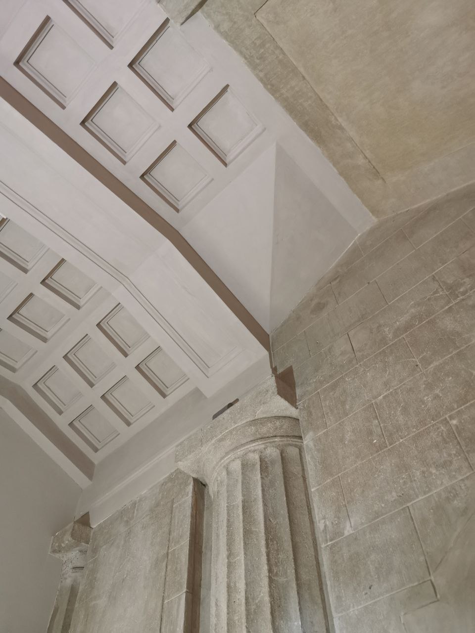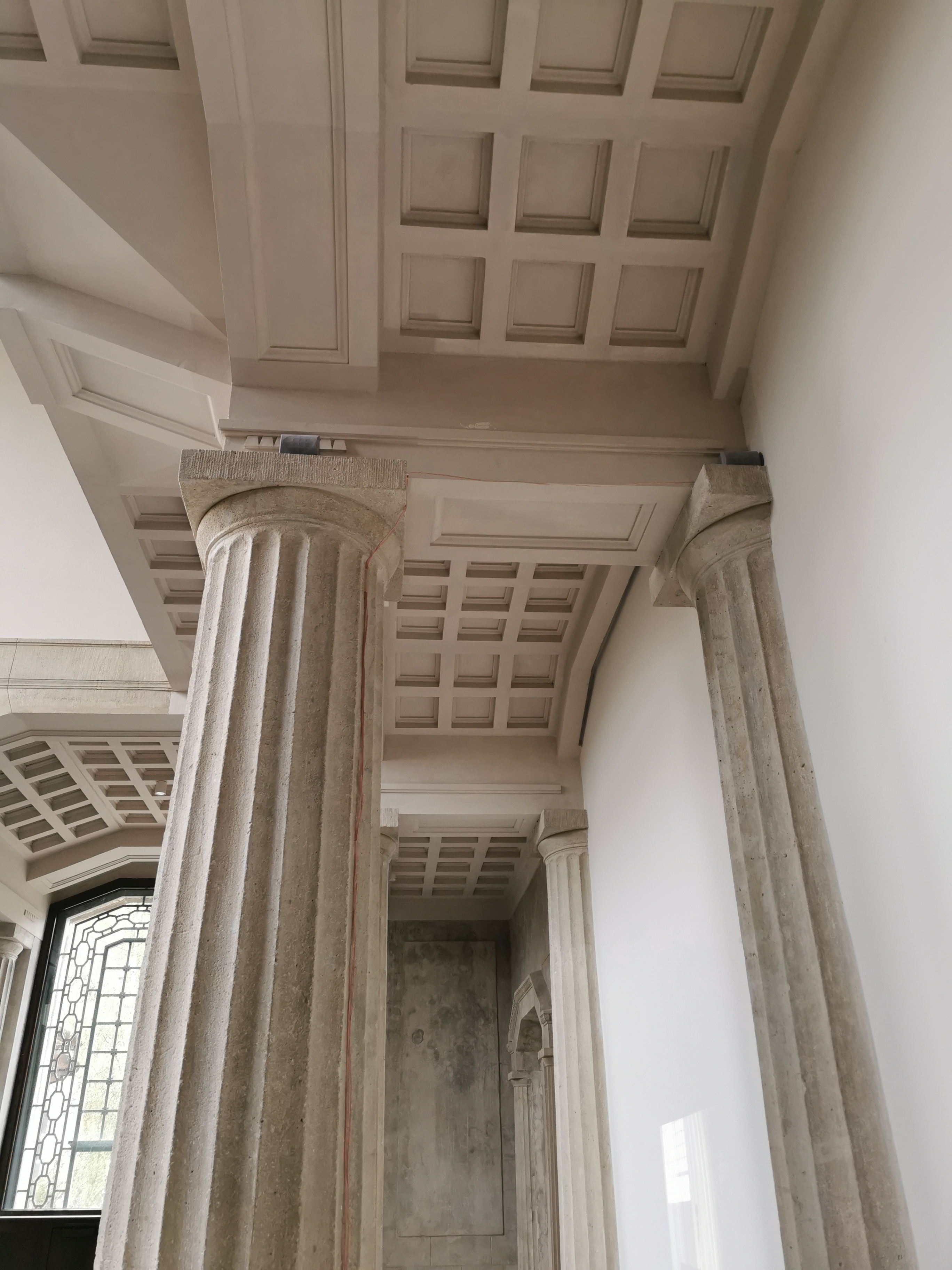 Ecken, meaning corners, highlight the ceiling texture of the entrance area of Villa Heike in front of the main exhibition hall. The ceilings texture remind me to a folded origami paper, likewise, it looks like in a process of folding and unfolding surfaces. Folding surfaces create corners, that hide and show. The 3 Loudspeakers are positioned high on the columns, to direct the visitors attention upwards towards these visual forms – a flood light emphasize these shapes and lines. The sound which originated from rustling recordings of papers, is folded into different sonic spaces, reverberating simultaneously in different rooms at one place and time, folding and unfolding between the actual physical space and the memories of other distant acoustics.