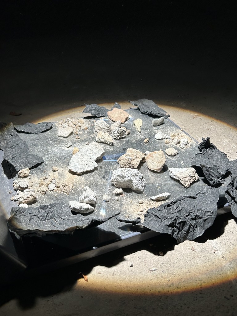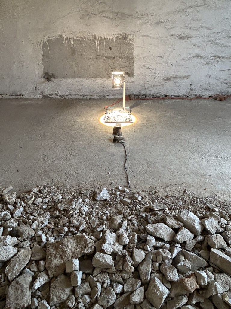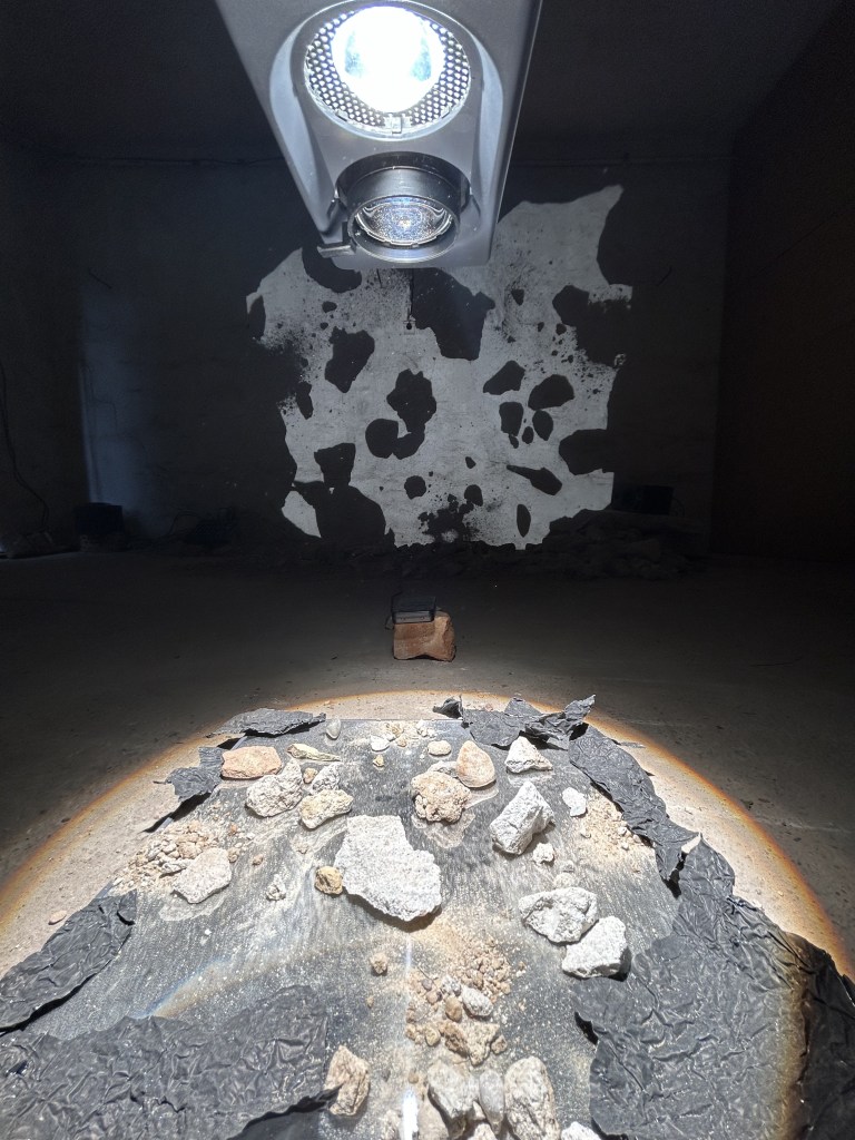II channel sound and light installation with overhead projector, stones, foil, earth, concrete